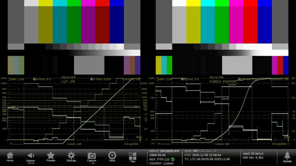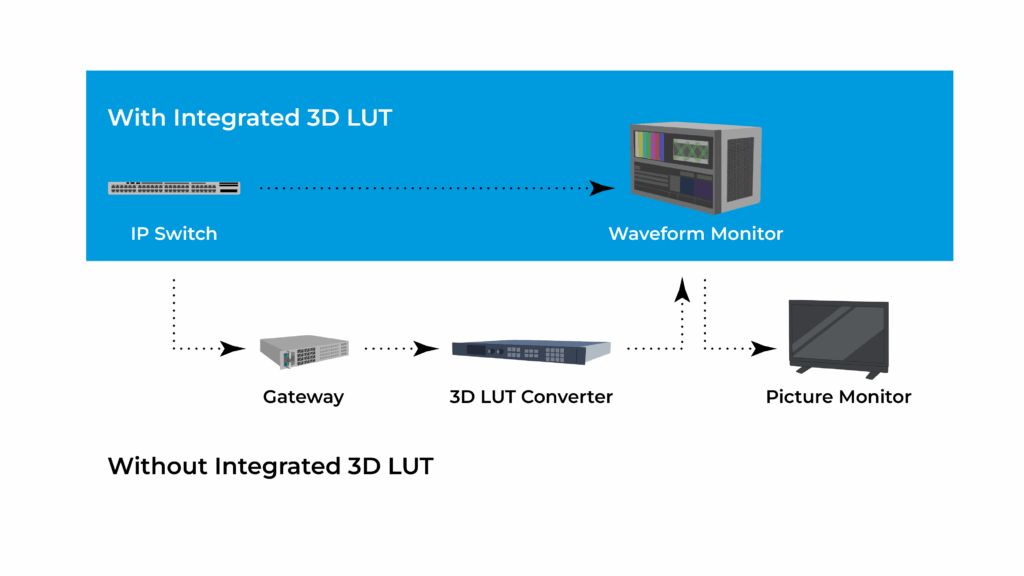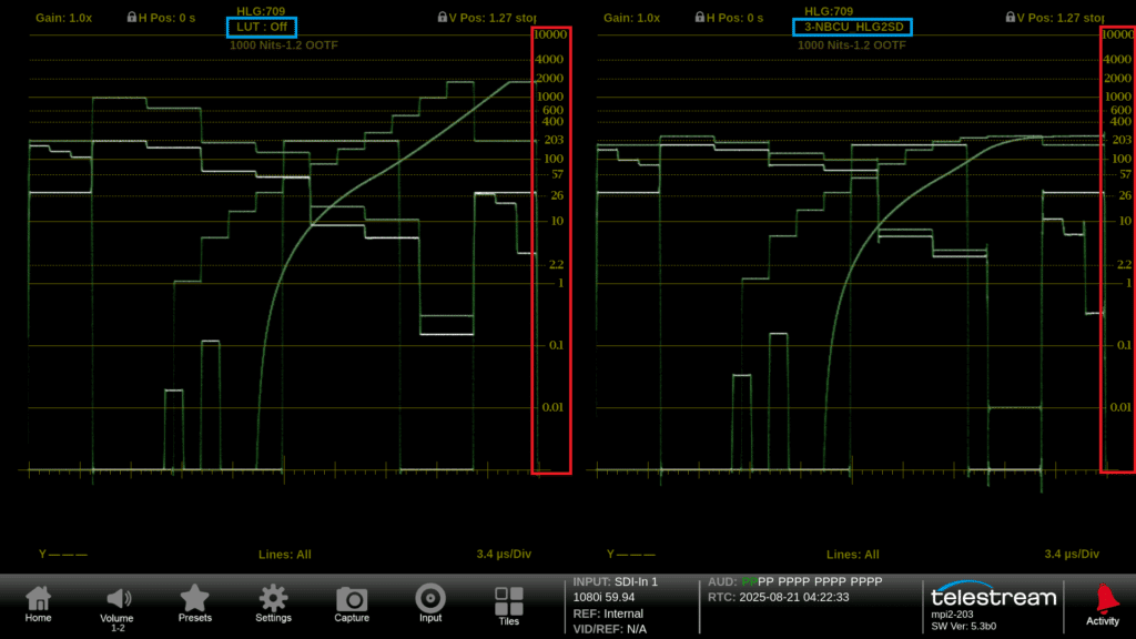 However, comparing these HDR and SDR signal feeds presents a few challenges. First, HDR and SDR signals have different gammas. For example, when users compare 100% white (203nits) brightness between the two feeds, the waveform traces appear at different vertical positions, making direct visual comparison challenging and requiring extra interpretation. In addition, monitoring both HDR and SDR feeds typically requires multiple picture monitors, external 3D LUT boxes, and physical controls to toggle between LUTs at the technical director’s position, resulting in a more complex system and workflow setup.